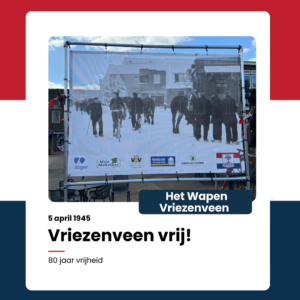 Zaterdag 5 april is Vriezenveen 80 jaar vrij! Vanaf 14:00 uur is er een optocht met historische voertuigen en figuranten van Theatergroep Stroef. Om ca. 16:00 uur is de aankomst op het Manitobaplein. Daar zullen de voertuigen parkeren. De Vriezenveense Harmonie geeft een bevrijdingsconcert van 16:30-17:30 uur. Daarna proosten we op 80 jaar vrijheid!